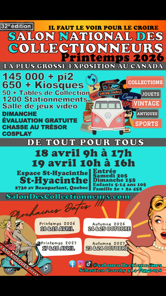 Que vous soyez collectionneur aguerri, amateur de nostalgie ou simplement à la recherche d’une activité originale à faire en famille, le Salon National des Collectionneurs est l’endroit idéal. L’ambiance conviviale, la diversité des kiosques et la richesse des activités en font un événement accessible et divertissant pour tous.